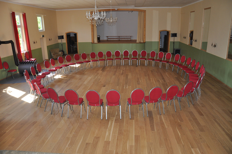 Der Seminarraum mit Oberlicht ist im vorderen Teil des Hauses. Er besteht aus zwei Teilen 85 qm und 50 qm. Eine Lehmwandheizung erfreut die Nutzer mit natürlicher Strahlungswärme. Mit zusätzlichen
