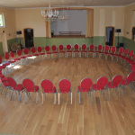 dürfte so 150 qm sein. Der Raum kann frei oder bestuhlt genutzt werden. In der Ausstattung sind optional auch runde Tische und Tischdecken / rot vorhanden. In der Ausstattung sind außerdem eine