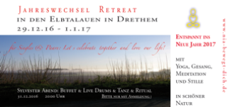 Yoga & Yoga Nidra, Breath Walk, Mantren Singengeführte Meditationen, Klang und StimmeFreitag: Tag der Stille - SchweigenSylvester Abend: offen für GästeBuffet am Abend, Life Musik mit Tanz und Trommeln, stilles Ritual zum ÜbergangNeujahr: lange Neujahrsmeditation mit Yoga und Gesang, abschließender Spaziergangdas Atelier ist für dich zum Malen immer geöffnetTeilnahme nur mit Anmeldung möglich!Anreise Donnerstag ab 11.00 UhrAbreise Neujahr Mittag nach dem Mittagessen gegen 15.00 Uhr